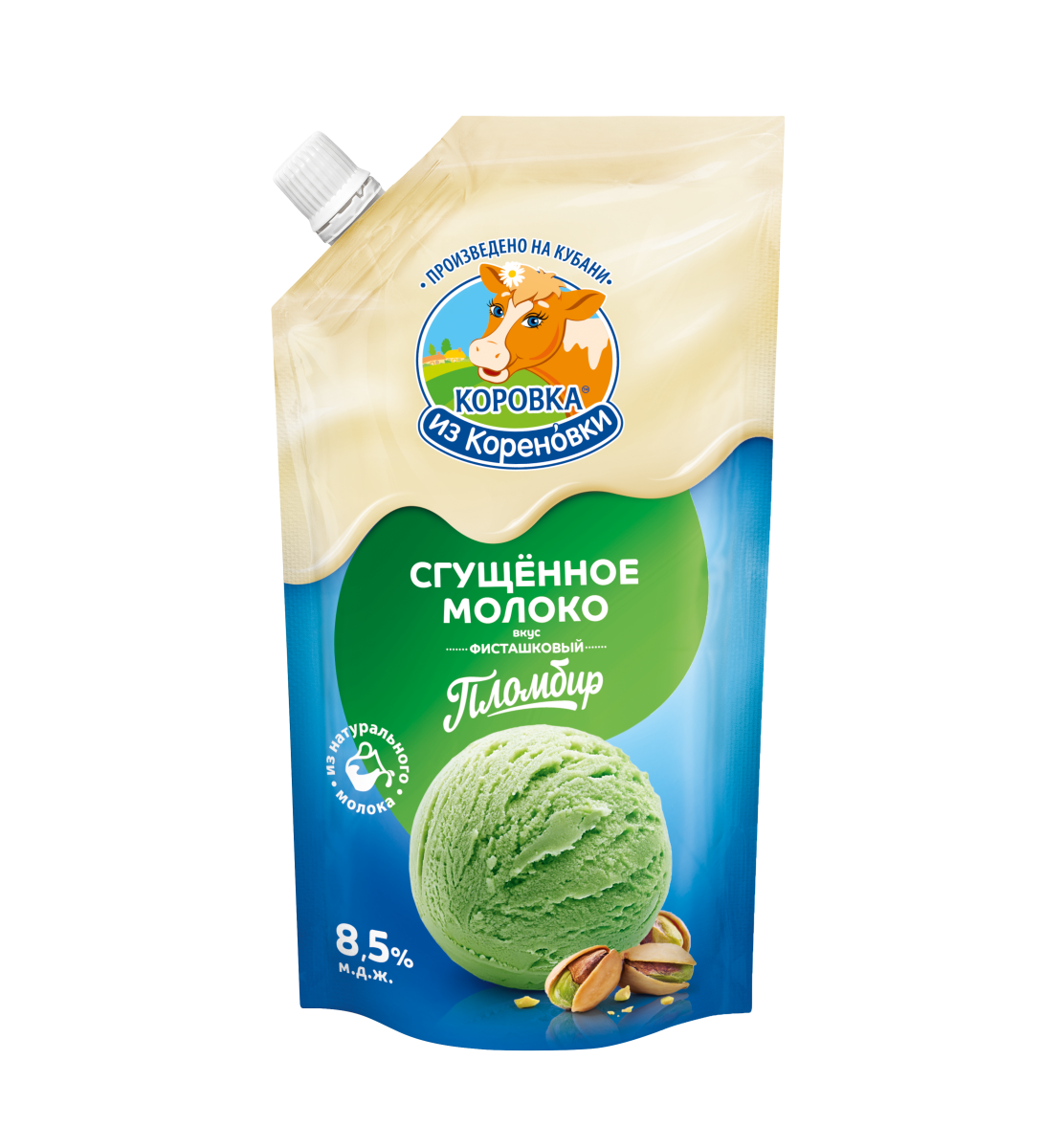 Состав: молоко цельное, молоко обезжиренное, сахара (сахароза, лактоза), ароматизатор «Фисташки жареные», натуральные красители: медные комплексы хлорофиллинов, куркумин