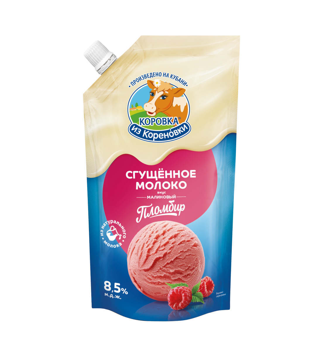 Состав: молоко цельное, молоко обезжиренное, сахара (сахароза, лактоза), краситель кармины, ароматизатор «Малина»