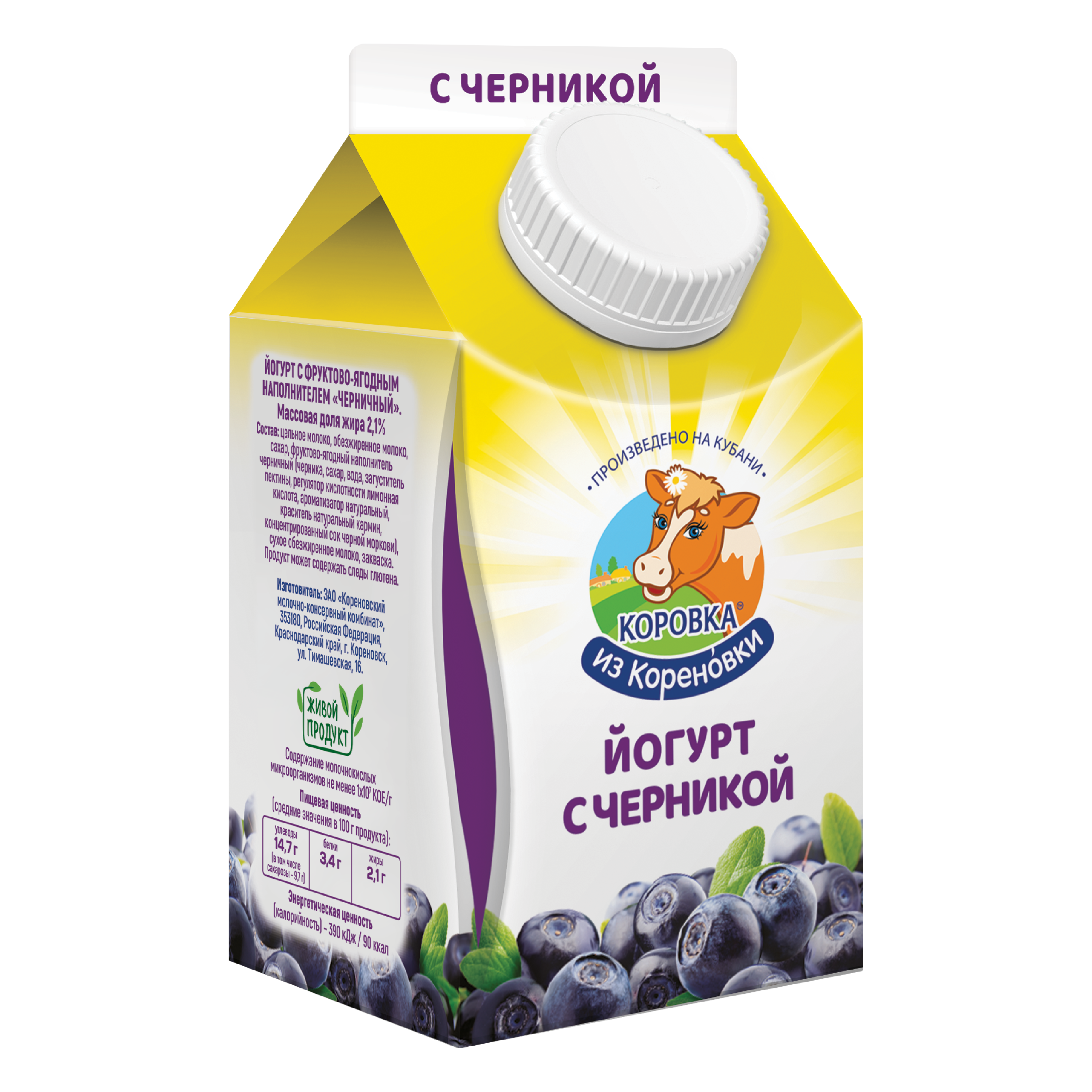 Состав: цельное молоко, обезжиренное молоко, сахар, фруктово-ягодный наполнитель «Черничный» (сахар, ягода черники, плодово-ягодное пюре (яблочное пюре, пюре черничное), загуститель пектин, регулятор кислотности лимонная кислота), сухое обезжиренное молоко, с использованием закваски на основе молочнокислых микроорганизмов.