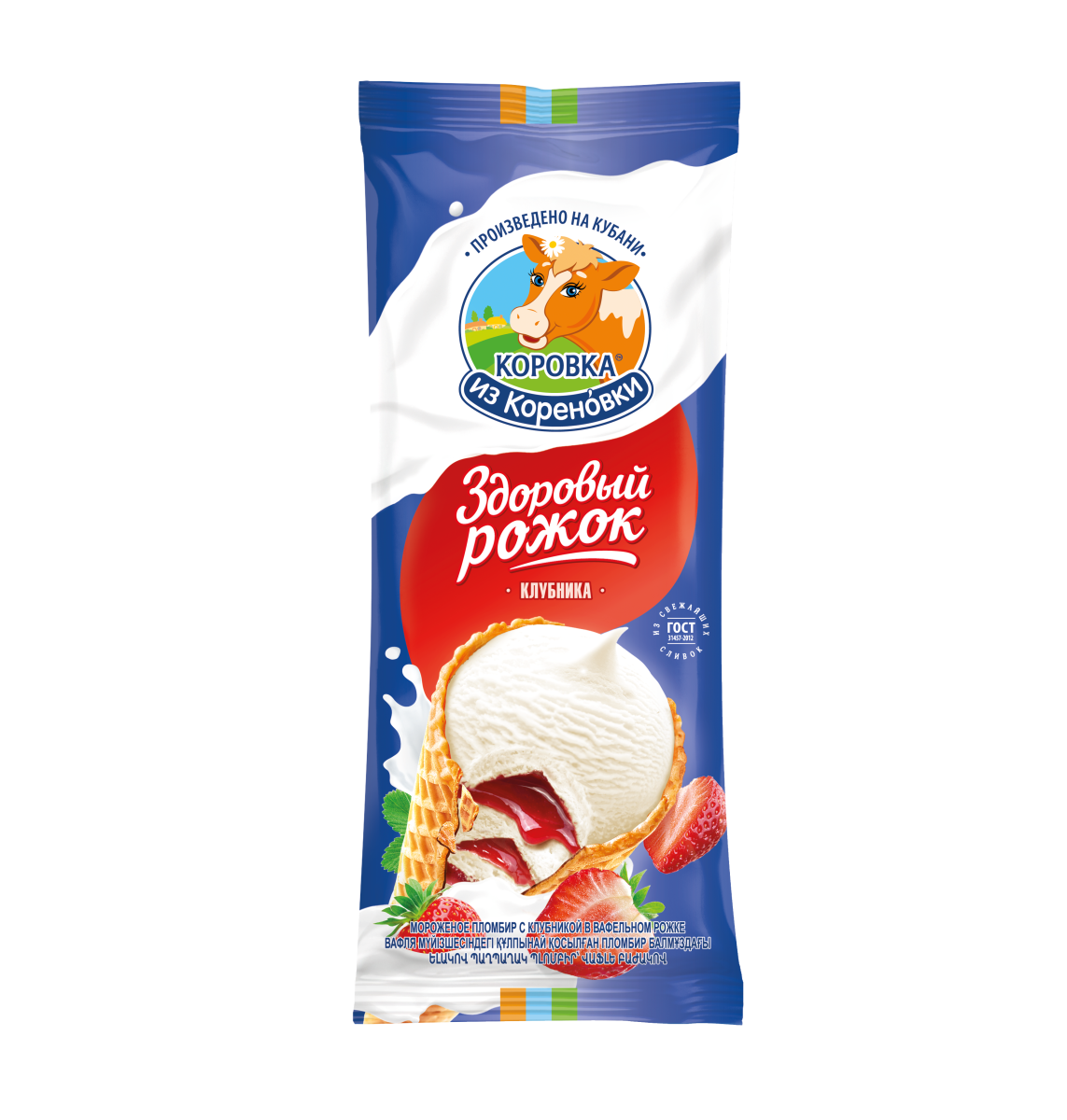 Состав: сливки, фруктово-ягодный наполнитель «Клубничный», вафельный сахарный рожок, глазурь, молоко концентрированное обезжиренное, молоко цельное сгущенное с сахаром, сахар, масло сливочное, комплексная пищевая добавка (эмульгатор: моно- и диглицериды жирных кислот, стабилизаторы: камеди рожкового дерева и гуаровая, каррагинан), ароматизатор ванилин. Состав наполнителя «Клубничный»: сахар, клубника, яблочное пюре, пюре клубники, загуститель пектин, регулятор кислотности лимонная кислота, натуральный краситель кармин. Состав вафельного сахарного рожка: мука пшеничная хлебопекарная, сахар, масло кокосовое, клетчатка пшеничная, эмульгатор соевый лецитин, вода, ароматизатор «Ванилин». Состав глазури: сахар, какао тертое, какао-масло, обезвоженный молочный жир, масло кокосовое, эмульгатор соевый лецитин, ароматизатор ванилин, эмульгатор Е 476.